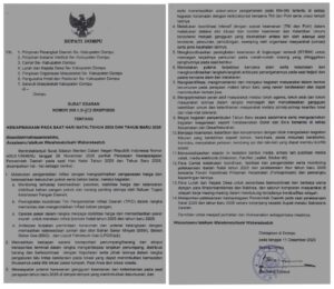 Dompu – Menjelang perayaan Natal 2025 dan Tahun Baru 2026, Bupati Dompu mengeluarkan Surat Edaran Nomor 200.1.3/453/BKBP/2025 tentang Kesiapsiagaan Daerah. Edaran tersebut ditujukan kepada seluruh perangkat daerah, camat, kepala desa, pimpinan instansi vertikal, organisasi masyarakat, serta pelaku usaha hotel dan restoran.